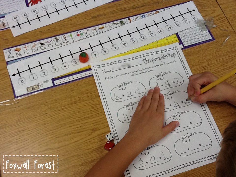 I couldn’t wait to do pumpkin activities only on Friday so we are already beginning to use pumpkin themed activities! (Can you tell I was also the kid that would buy Christmas gifts for my family ahead of time and then be so incredibly excited to give it to them that I would give it to them before Christmas, because I just simply couldn’t wait!? Yes, guilty as charged! I just ordered a Christmas gift for my hubby and I’m not even opening the Amazon shipping box so that I’m not tempted to give it to him beforehand! Ha! Let’s see how long I can hold out… ๐ Tomorrow we are going to be using our pumpkin number lines to do the Pumpkin Hop! I have my pumpkin number lines and recording pages all ready for my higher kiddos that will add 3 numbers with 3 dice and then the rest of the kids will use 2 dice for the addition! The kids LOVE using the pumpkin candy on the number line! Oh my goodness-it motivates them so much and they work so hard while they do it: